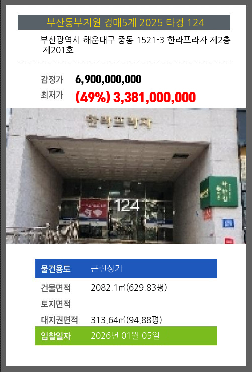 사건번호 2025 타경 124 본건은 부산광역시 해운대구 중동 1521-3 한라프라자 제2층 제201호소재하는 근린상가경매 물건의 포스팅입니다. 건물면적 [ 2082.1㎡ (629.83평) ]대지권 [ 313.64㎡ (94.88평) ] 시세를