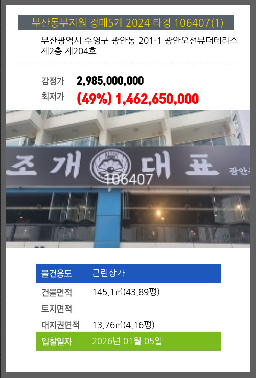 사건번호 2024 타경 106407(1) 본건은 부산광역시 수영구 광안동 201-1 광안오션뷰더테라스 제2층 제204호소재하는 근린상가경매 물건의 포스팅입니다. 건물면적 [ 145.1㎡ (43.89평) ]대지권 [ 13.76㎡ (4.16평) ] 시세를