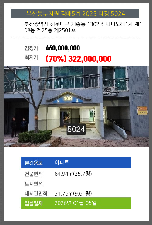 사건번호 2025 타경 5024 본건은 부산광역시 해운대구 재송동 1302 센텀피오레1차 제108동 제25층 제2501호소재하는 아파트경매 물건의 포스팅입니다. 건물면적 [ 84.94㎡ (25.7평) ]대지권 [ 31.76㎡ (9.61평) ]