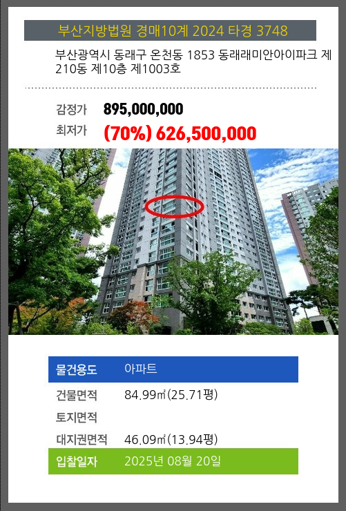사건번호 2024 타경 3748 본건은 부산광역시 동래구 온천동 1853 동래래미안아이파크 제210동 제10층 제1003호소재하는 아파트경매 물건의 포스팅입니다. 건물면적 [ 84.99㎡ (25.71평) ]대지권 [ 46.09㎡ (13.94평) ]