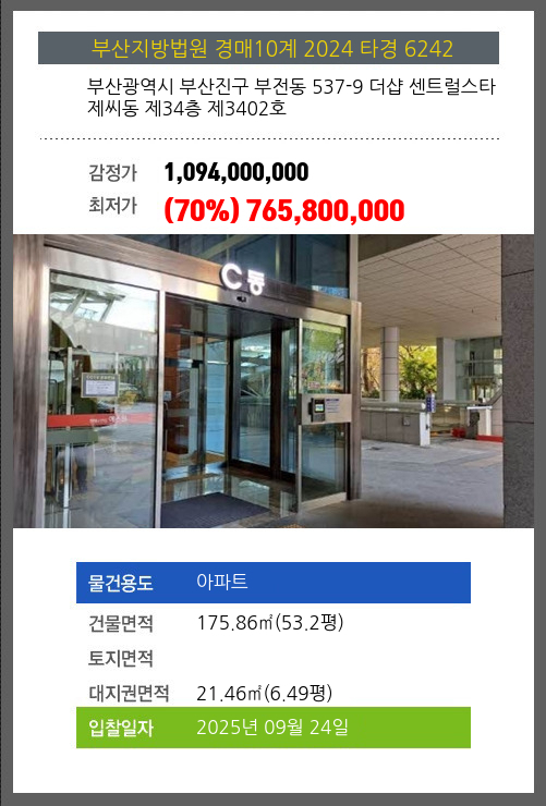 사건번호 2024 타경 6242 본건은 부산광역시 부산진구 부전동 537-9 더샵 센트럴스타 제씨동 제34층 제3402호소재하는 아파트경매 물건의 포스팅입니다. 건물면적 [ 175.86㎡ (53.2평) ]대지권 [ 21.46㎡ (6.49평)