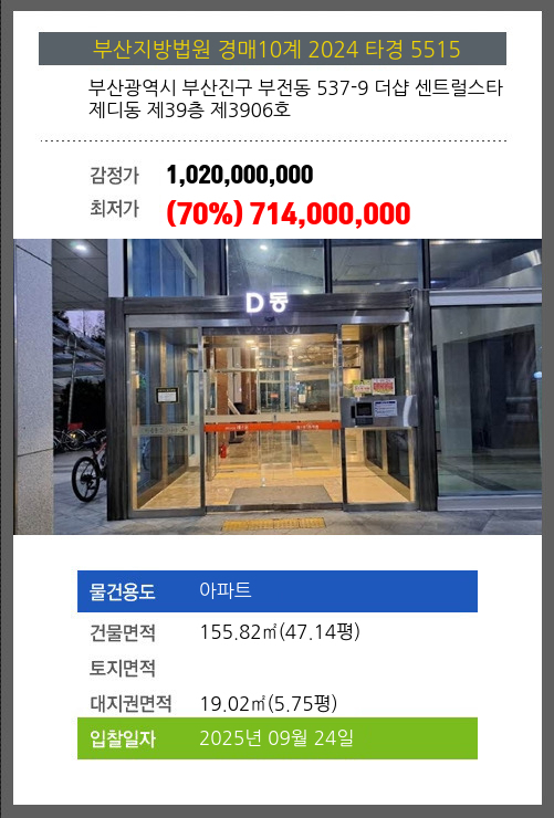 사건번호 2024 타경 5515 본건은 부산광역시 부산진구 부전동 537-9 더샵 센트럴스타 제디동 제39층 제3906호소재하는 아파트경매 물건의 포스팅입니다. 건물면적 [ 155.82㎡ (47.14평) ]대지권 [ 19.02㎡ (5.75평)