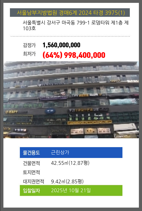 사건번호 2024 타경 3975(1) 본건은 서울특별시 강서구 마곡동 799-1 로뎀타워 제1층 제103호소재하는 근린상가경매 물건의 포스팅입니다. 건물면적 [ 42.55㎡ (12.87평) ]대지권 [ 9.42㎡ (2.85평) ] 시세를