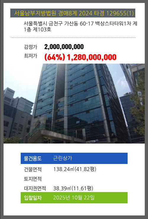 사건번호 2024 타경 129655(1) 본건은 서울특별시 금천구 가산동 60-17 백상스타타워1차 제1층 제103호소재하는 근린상가경매 물건의 포스팅입니다. 건물면적 [ 138.24㎡ (41.82평) ]대지권 [ 38.39㎡ (11.61평) ] 시세를