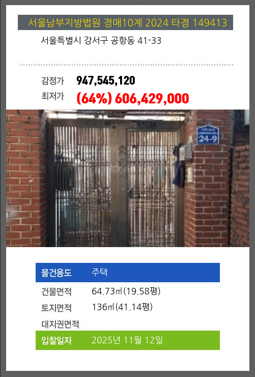 사건번호 2024 타경 149413 본건은 서울특별시 강서구 공항동 41-33소재하는 주택경매 물건의 포스팅입니다. 건물면적 [ 64.73㎡ (19.58평) ]토지면적 [ 136㎡ (41.14평) ] 시세를 반영한 감정가 947,545,120에서2회