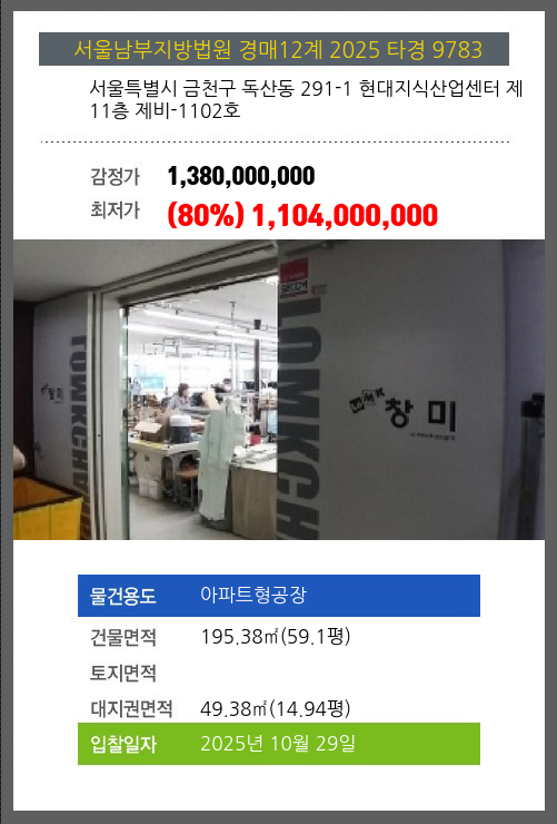 사건번호 2025 타경 9783 본건은 서울특별시 금천구 독산동 291-1 현대지식산업센터 제11층 제비-1102호소재하는 아파트형공장경매 물건의 포스팅입니다. 건물면적 [ 195.38㎡ (59.1평) ]대지권 [ 49.38㎡ (14.94평) ] 시세를