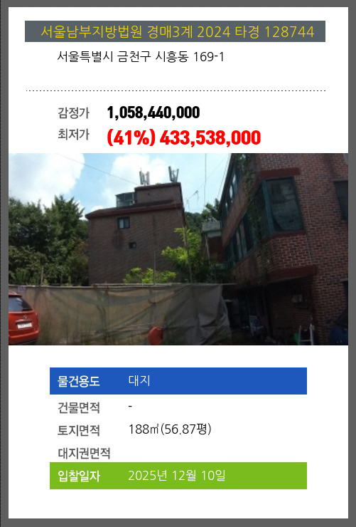 사건번호 2024 타경 128744 본건은 서울특별시 금천구 시흥동 169-1소재하는 대지경매 물건의 포스팅입니다. 토지면적 [ 188㎡ (56.87평) ] 시세를 반영한 감정가 1,058,440,000에서4회 유찰되어 감정가 대비 41%최저가