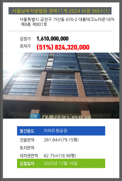 사건번호 2024 타경 3661(1) 본건은 서울특별시 금천구 가산동 670-2 대륭테크노타운18차 제8층 제801호소재하는 아파트형공장경매 물건의 포스팅입니다. 건물면적 [ 261.64㎡ (79.15평) ]대지권 [ 62.75㎡ (18.98평) ] 시세를