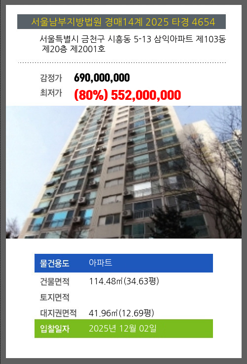 사건번호 2025 타경 4654 본건은 서울특별시 금천구 시흥동 5-13 삼익아파트 제103동 제20층 제2001호소재하는 아파트경매 물건의 포스팅입니다. 건물면적 [ 114.48㎡ (34.63평) ]대지권 [ 41.96㎡ (12.69평) ]