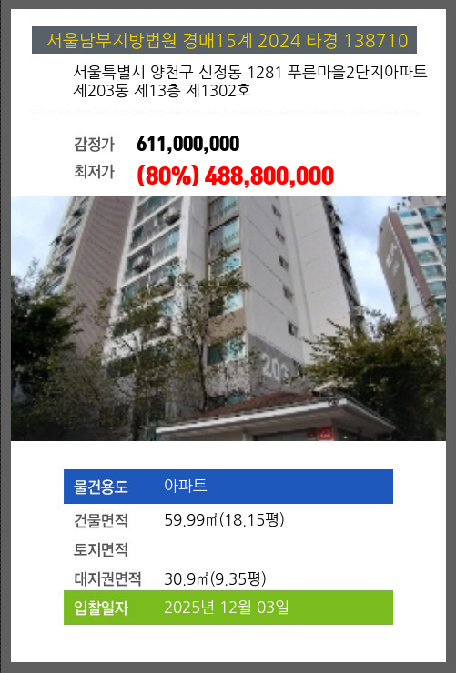 사건번호 2024 타경 138710 본건은 서울특별시 양천구 신정동 1281 푸른마을2단지아파트 제203동 제13층 제1302호소재하는 아파트경매 물건의 포스팅입니다. 건물면적 [ 59.99㎡ (18.15평) ]대지권 [ 30.9㎡ (9.35평) ]