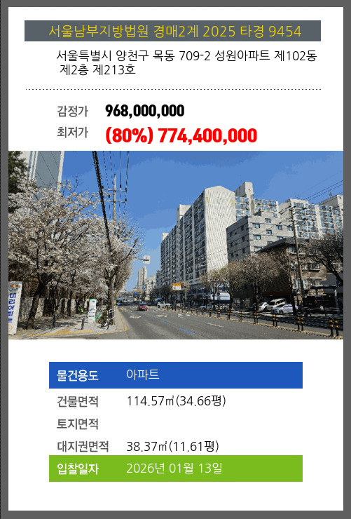사건번호 2025 타경 9454 본건은 서울특별시 양천구 목동 709-2 성원아파트 제102동 제2층 제213호소재하는 아파트경매 물건의 포스팅입니다. 건물면적 [ 114.57㎡ (34.66평) ]대지권 [ 38.37㎡ (11.61평) ]