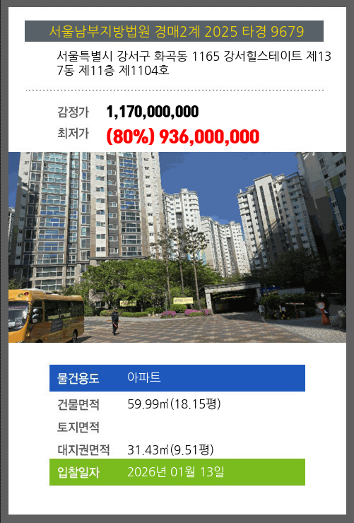 사건번호 2025 타경 9679 본건은 서울특별시 강서구 화곡동 1165 강서힐스테이트 제137동 제11층 제1104호소재하는 아파트경매 물건의 포스팅입니다. 건물면적 [ 59.99㎡ (18.15평) ]대지권 [ 31.43㎡ (9.51평) ]