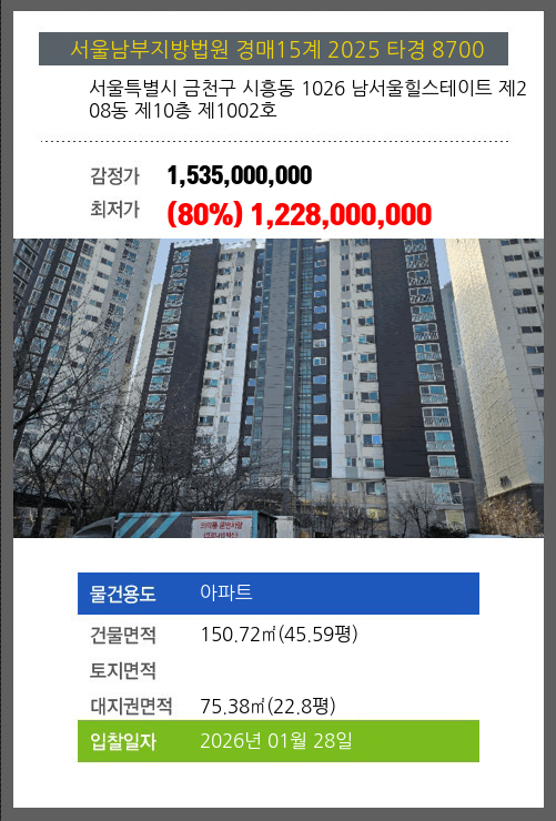 사건번호 2025 타경 8700 본건은 서울특별시 금천구 시흥동 1026 남서울힐스테이트 제208동 제10층 제1002호소재하는 아파트경매 물건의 포스팅입니다. 건물면적 [ 150.72㎡ (45.59평) ]대지권 [ 75.38㎡ (22.8평) ]