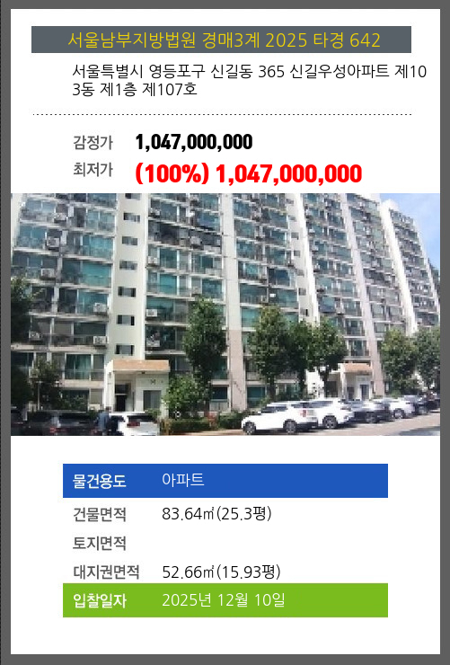 사건번호 2025 타경 642 본건은 서울특별시 영등포구 신길동 365 신길우성아파트 제103동 제1층 제107호소재하는 아파트경매 물건의 포스팅입니다. 건물면적 [ 83.64㎡ (25.3평) ]대지권 [ 52.66㎡ (15.93평) ]