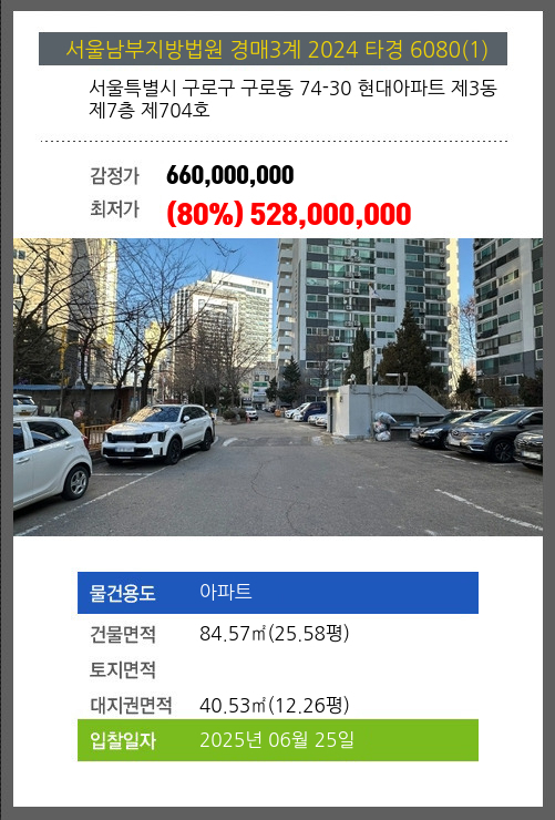 사건번호 2024 타경 6080(1) 본건은 서울특별시 구로구 구로동 74-30 현대아파트 제3동 제7층 제704호소재하는 아파트경매 물건의 포스팅입니다. 건물면적 [ 84.57㎡ (25.58평) ]대지권 [ 40.53㎡ (12.26평) ]