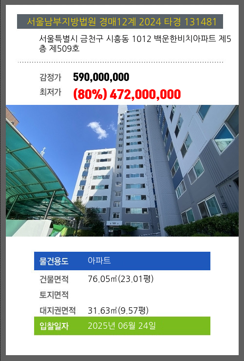 사건번호 2024 타경 131481 본건은 서울특별시 금천구 시흥동 1012 백운한비치아파트 제5층 제509호소재하는 아파트경매 물건의 포스팅입니다. 건물면적 [ 76.05㎡ (23.01평) ]대지권 [ 31.63㎡ (9.57평) ] 시세를