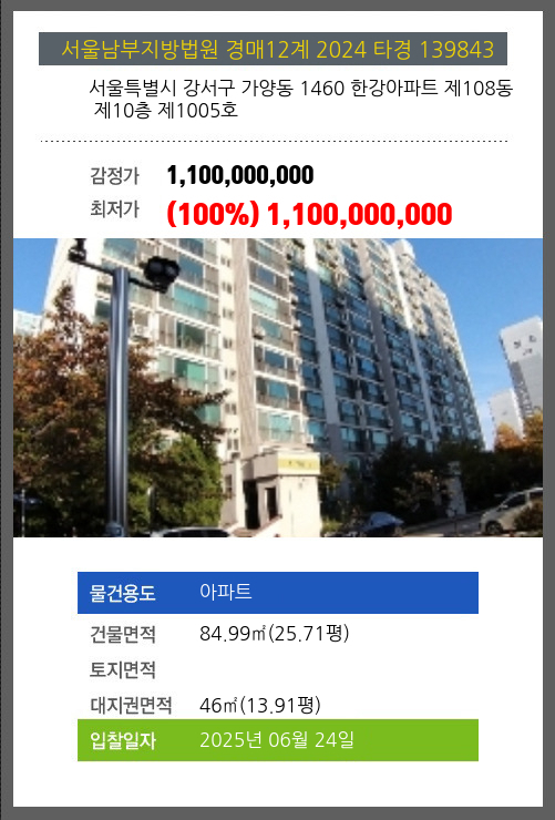 사건번호 2024 타경 139843 본건은 서울특별시 강서구 가양동 1460 한강아파트 제108동 제10층 제1005호소재하는 아파트경매 물건의 포스팅입니다. 건물면적 [ 84.99㎡ (25.71평) ]대지권 [ 46㎡ (13.91평) ]