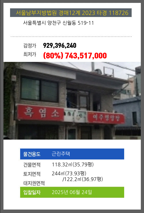 사건번호 2023 타경 118726 본건은 서울특별시 양천구 신월동 519-11소재하는 근린주택경매 물건의 포스팅입니다. 건물면적 [ 118.32㎡ (35.79평) ]토지면적 [ 전체:244㎡ (73.93평) 매각지분:122.2㎡ (36.97평) ] 시세를 반영한