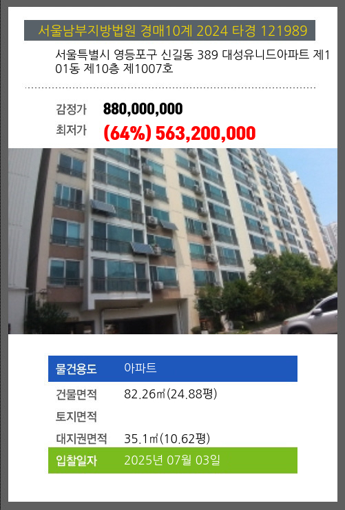 사건번호 2024 타경 121989 본건은 서울특별시 영등포구 신길동 389 대성유니드아파트 제101동 제10층 제1007호소재하는 아파트경매 물건의 포스팅입니다. 건물면적 [ 82.26㎡ (24.88평) ]대지권 [ 35.1㎡ (10.62평) ]