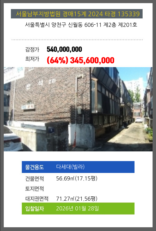 사건번호 2024 타경 135339 본건은 서울특별시 양천구 신월동 606-11 제2층 제201호소재하는 다세대(빌라)경매 물건의 포스팅입니다. 건물면적 [ 56.69㎡ (17.15평) ]대지권 [ 71.27㎡ (21.56평) ] 시세를 반영한