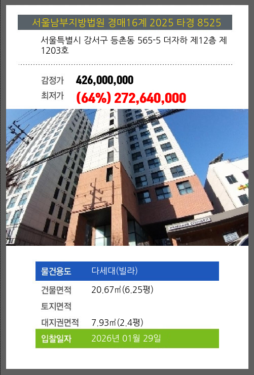 사건번호 2025 타경 8525 본건은 서울특별시 강서구 등촌동 565-5 더자하 제12층 제1203호소재하는 다세대(빌라)경매 물건의 포스팅입니다. 건물면적 [ 20.67㎡ (6.25평) ]대지권 [ 7.93㎡ (2.4평) ] 시세를