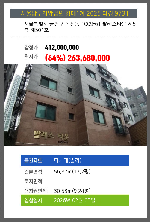 사건번호 2025 타경 9731 본건은 서울특별시 금천구 독산동 1009-61 팔레스타운 제5층 제501호소재하는 다세대(빌라)경매 물건의 포스팅입니다. 건물면적 [ 56.87㎡ (17.2평) ]대지권 [ 30.53㎡ (9.24평) ] 시세를
