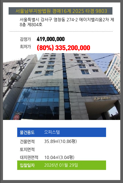사건번호 2025 타경 9803 본건은 서울특별시 강서구 염창동 274-2 에이치밸리움2차 제8층 제804호소재하는 오피스텔경매 물건의 포스팅입니다. 건물면적 [ 35.89㎡ (10.86평) ]대지권 [ 10.04㎡ (3.04평) ] 시세를