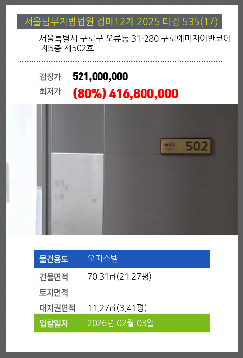 사건번호 2025 타경 535(17) 본건은 서울특별시 구로구 오류동 31-280 구로예미지어반코어 제5층 제502호소재하는 오피스텔경매 물건의 포스팅입니다. 건물면적 [ 70.31㎡ (21.27평) ]대지권 [ 11.27㎡ (3.41평) ] 시세를