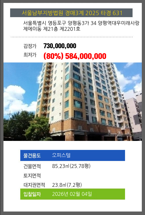 사건번호 2025 타경 631 본건은 서울특별시 영등포구 양평동3가 34 양평역대우미래사랑 제에이동 제21층 제2201호소재하는 오피스텔경매 물건의 포스팅입니다. 건물면적 [ 85.23㎡ (25.78평) ]대지권 [ 23.8㎡ (7.2평) ]
