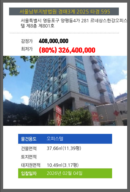 사건번호 2025 타경 595 본건은 서울특별시 영등포구 양평동4가 281 르네상스한강오피스텔 제8층 제801호소재하는 오피스텔경매 물건의 포스팅입니다. 건물면적 [ 37.66㎡ (11.39평) ]대지권 [ 10.49㎡ (3.17평) ] 시세를