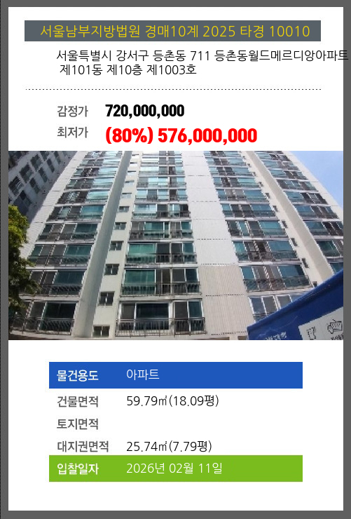 사건번호 2025 타경 10010 본건은 서울특별시 강서구 등촌동 711 등촌동월드메르디앙아파트 제101동 제10층 제1003호소재하는 아파트경매 물건의 포스팅입니다. 건물면적 [ 59.79㎡ (18.09평) ]대지권 [ 25.74㎡ (7.79평) ]