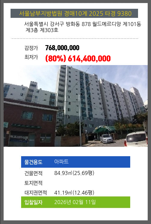 사건번호 2025 타경 9380 본건은 서울특별시 강서구 방화동 878 월드메르디앙 제101동 제3층 제303호소재하는 아파트경매 물건의 포스팅입니다. 건물면적 [ 84.93㎡ (25.69평) ]대지권 [ 41.19㎡ (12.46평) ]