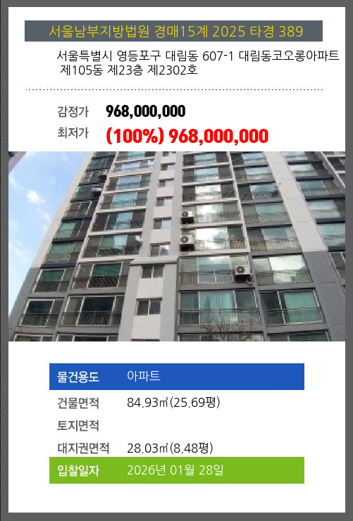 사건번호 2025 타경 389 본건은 서울특별시 영등포구 대림동 607-1 대림동코오롱아파트 제105동 제23층 제2302호소재하는 아파트경매 물건의 포스팅입니다. 건물면적 [ 84.93㎡ (25.69평) ]대지권 [ 28.03㎡ (8.48평) ]