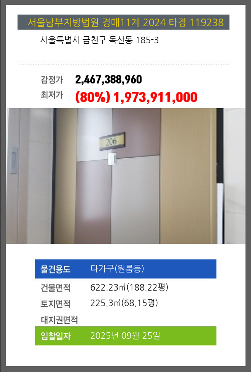 사건번호 2024 타경 119238 본건은 서울특별시 금천구 독산동 185-3소재하는 다가구(원룸등)경매 물건의 포스팅입니다. 건물면적 [ 622.23㎡ (188.22평) ]토지면적 [ 225.3㎡ (68.15평) ] 시세를 반영한 감정가 2,467,388,960에서1회