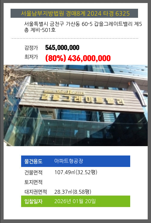 사건번호 2024 타경 6325 본건은 서울특별시 금천구 가산동 60-5 갑을그레이트밸리 제5층 제비-501호소재하는 아파트형공장경매 물건의 포스팅입니다. 건물면적 [ 107.49㎡ (32.52평) ]대지권 [ 28.37㎡ (8.58평) ] 시세를