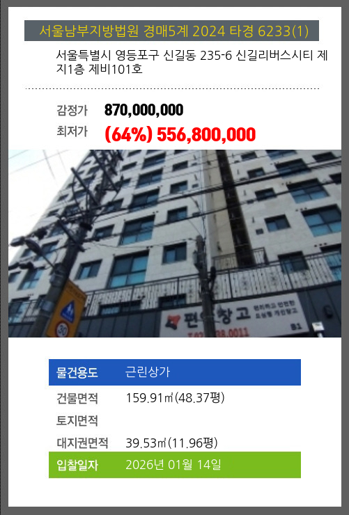 사건번호 2024 타경 6233(1) 본건은 서울특별시 영등포구 신길동 235-6 신길리버스시티 제지1층 제비101호소재하는 근린상가경매 물건의 포스팅입니다. 건물면적 [ 159.91㎡ (48.37평) ]대지권 [ 39.53㎡ (11.96평) ] 시세를