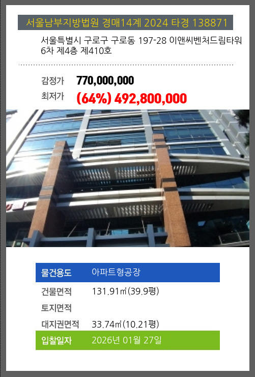 사건번호 2024 타경 138871 본건은 서울특별시 구로구 구로동 197-28 이앤씨벤처드림타워6차 제4층 제410호소재하는 아파트형공장경매 물건의 포스팅입니다. 건물면적 [ 131.91㎡ (39.9평) ]대지권 [ 33.74㎡ (10.21평) ] 시세를