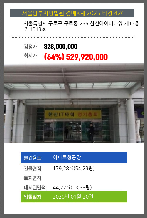 사건번호 2025 타경 426 본건은 서울특별시 구로구 구로동 235 한신아이티타워 제13층 제1313호소재하는 아파트형공장경매 물건의 포스팅입니다. 건물면적 [ 179.28㎡ (54.23평) ]대지권 [ 44.22㎡ (13.38평) ] 시세를