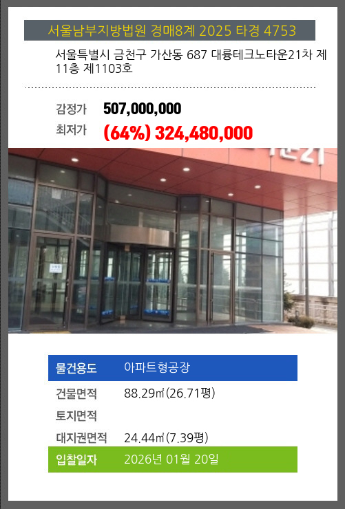 사건번호 2025 타경 4753 본건은 서울특별시 금천구 가산동 687 대륭테크노타운21차 제11층 제1103호소재하는 아파트형공장경매 물건의 포스팅입니다. 건물면적 [ 88.29㎡ (26.71평) ]대지권 [ 24.44㎡ (7.39평) ] 시세를