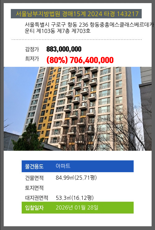 사건번호 2024 타경 143217 본건은 서울특별시 구로구 항동 236 항동중흥에스클래스베르데카운티 제103동 제7층 제703호소재하는 아파트경매 물건의 포스팅입니다. 건물면적 [ 84.99㎡ (25.71평) ]대지권 [ 53.3㎡ (16.12평) ]