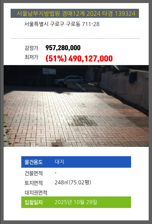 사건번호 2024 타경 139324 본건은 서울특별시 구로구 구로동 711-28소재하는 대지경매 물건의 포스팅입니다. 토지면적 [ 248㎡ (75.02평) ] 시세를 반영한 감정가 957,280,000에서3회 유찰되어 감정가 대비 51%최저가