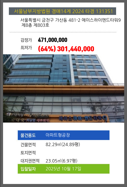 사건번호 2024 타경 131351 본건은 서울특별시 금천구 가산동 481-2 에이스하이엔드타워9 제8층 제803호소재하는 아파트형공장경매 물건의 포스팅입니다. 건물면적 [ 82.29㎡ (24.89평) ]대지권 [ 23.05㎡ (6.97평) ] 시세를