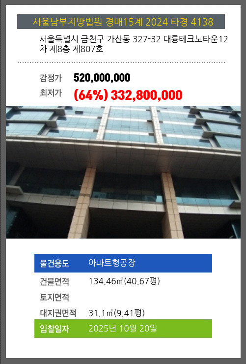사건번호 2024 타경 4138 본건은 서울특별시 금천구 가산동 327-32 대륭테크노타운12차 제8층 제807호소재하는 아파트형공장경매 물건의 포스팅입니다. 건물면적 [ 134.46㎡ (40.67평) ]대지권 [ 31.1㎡ (9.41평) ] 시세를