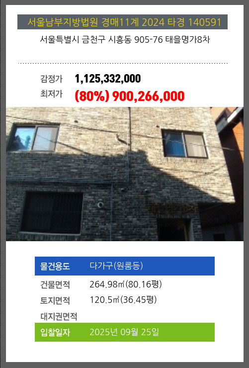 사건번호 2024 타경 140591 본건은 서울특별시 금천구 시흥동 905-76 태을명가8차소재하는 다가구(원룸등)경매 물건의 포스팅입니다. 건물면적 [ 264.98㎡ (80.16평) ]토지면적 [ 120.5㎡ (36.45평) ] 시세를 반영한 감정가