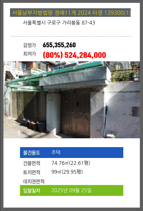 사건번호 2024 타경 139300(1) 본건은 서울특별시 구로구 가리봉동 87-43소재하는 주택경매 물건의 포스팅입니다. 건물면적 [ 74.76㎡ (22.61평) ]토지면적 [ 99㎡ (29.95평) ] 시세를 반영한 감정가 655,355,260에서1회