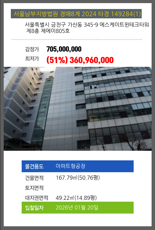 사건번호 2024 타경 149284(1) 본건은 서울특별시 금천구 가산동 345-9 에스케이트윈테크타워 제8층 제에이805호소재하는 아파트형공장경매 물건의 포스팅입니다. 건물면적 [ 167.79㎡ (50.76평) ]대지권 [ 49.22㎡ (14.89평) ] 시세를