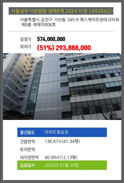 사건번호 2024 타경 149284(2) 본건은 서울특별시 금천구 가산동 345-9 에스케이트윈테크타워 제8층 제에이806호소재하는 아파트형공장경매 물건의 포스팅입니다. 건물면적 [ 136.67㎡ (41.34평) ]대지권 [ 40.09㎡ (12.13평) ] 시세를