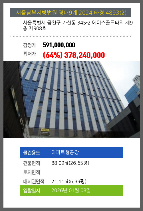 사건번호 2024 타경 4893(2) 본건은 서울특별시 금천구 가산동 345-2 에이스골드타워 제9층 제908호소재하는 아파트형공장경매 물건의 포스팅입니다. 건물면적 [ 88.09㎡ (26.65평) ]대지권 [ 21.11㎡ (6.39평) ] 시세를