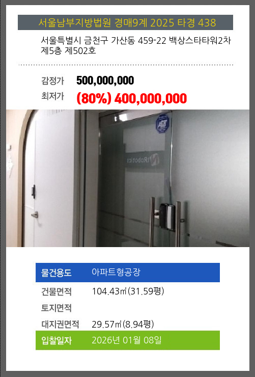 사건번호 2025 타경 438 본건은 서울특별시 금천구 가산동 459-22 백상스타타워2차 제5층 제502호소재하는 아파트형공장경매 물건의 포스팅입니다. 건물면적 [ 104.43㎡ (31.59평) ]대지권 [ 29.57㎡ (8.94평) ] 시세를