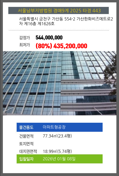 사건번호 2025 타경 443 본건은 서울특별시 금천구 가산동 554-2 가산한화비즈메트로2차 제16층 제1626호소재하는 아파트형공장경매 물건의 포스팅입니다. 건물면적 [ 77.34㎡ (23.4평) ]대지권 [ 18.99㎡ (5.74평) ] 시세를
